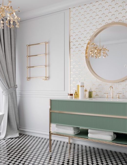mozaiki w odcieniach perłowych, srebrnych i mlecznych – rozświetlają wnętrze, nadając mu lekkości.