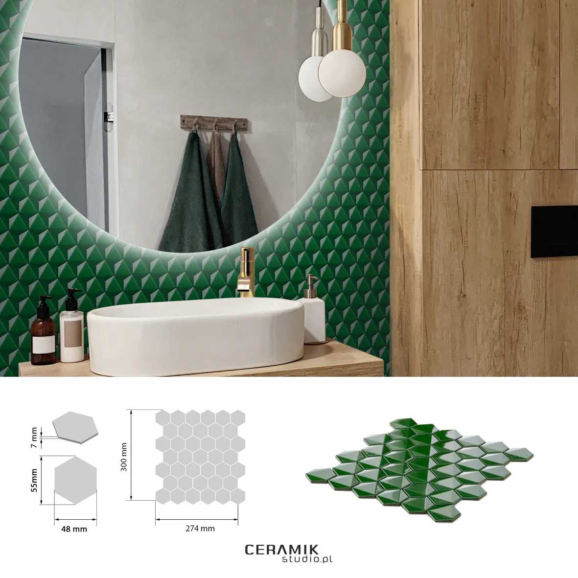 Charakterystyczny sześciokątny (heksagonowy) kształt w połączeniu ze strukturą 3D nadaje płytkom efekt przestrzenności – wyglądają jak wypukłe plastry heksagonu. Zielony odcień mozaiki dodaje wnętrzu świeżości, elegancji i naturalnego charakteru — idealny do połączenia z bielą, drewnem, a także ciemniejszymi tonami.