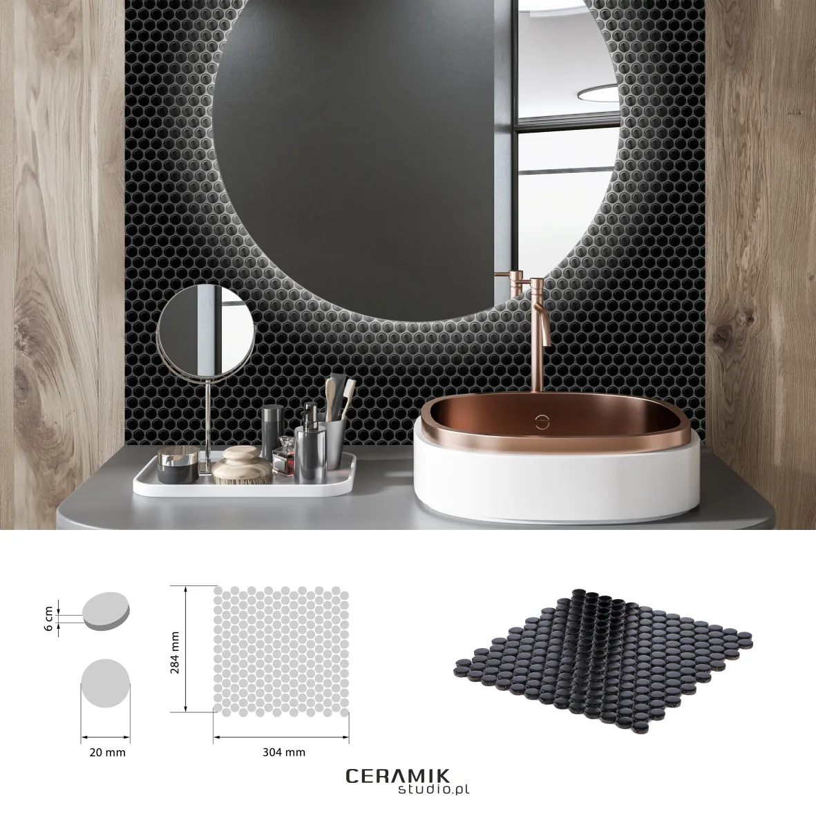 Każda mozaika Dots Black jest umieszczona na siatce o wymiarach 284 × 304 mm, co ułatwia precyzyjny montaż nawet przy samodzielnym układaniu. Rozmiar pojedynczej kostki to 20 × 20 mm, co pozwala na tworzenie detali i geometrycznych kompozycji.