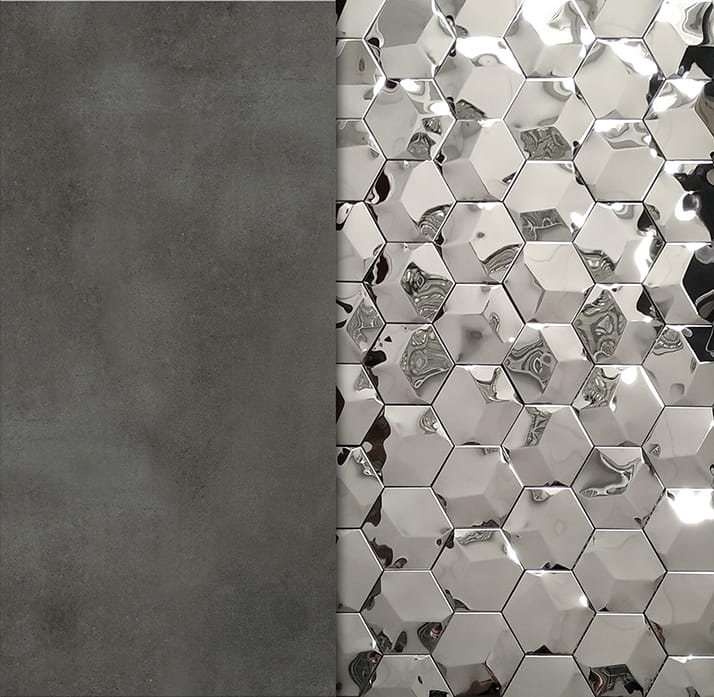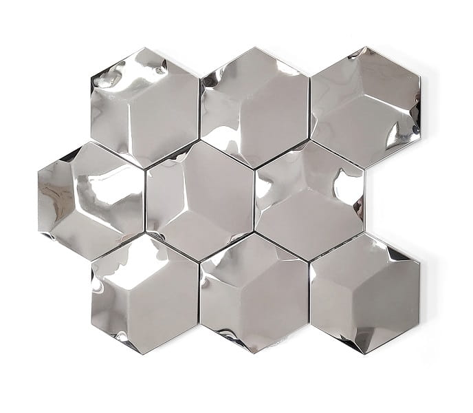Mozaika Heksagon Super Mirror to dekoracyjna mozaika ceramiczna w kształcie sześciokątów (heksagonów) z efektem lustrzanego połysku. Dzięki wbudowanej blaszce ze stali nierdzewnej (inox) odbija światło, optycznie powiększa przestrzeń i nadaje wnętrzom elegancki, nowoczesny charakter.