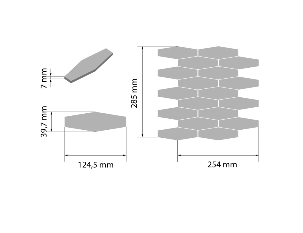 Nowoczesna mozaika ścienna w kształcie wydłużonego heksagonu, kolor biały połysk, forma plastra 285 × 284 mm (kostki 39,7 × 124,5 mm). Idealna do łazienek, kuchni i stref SPA. Produkt wysokiej jakości do sklepu e-plytki.eu.