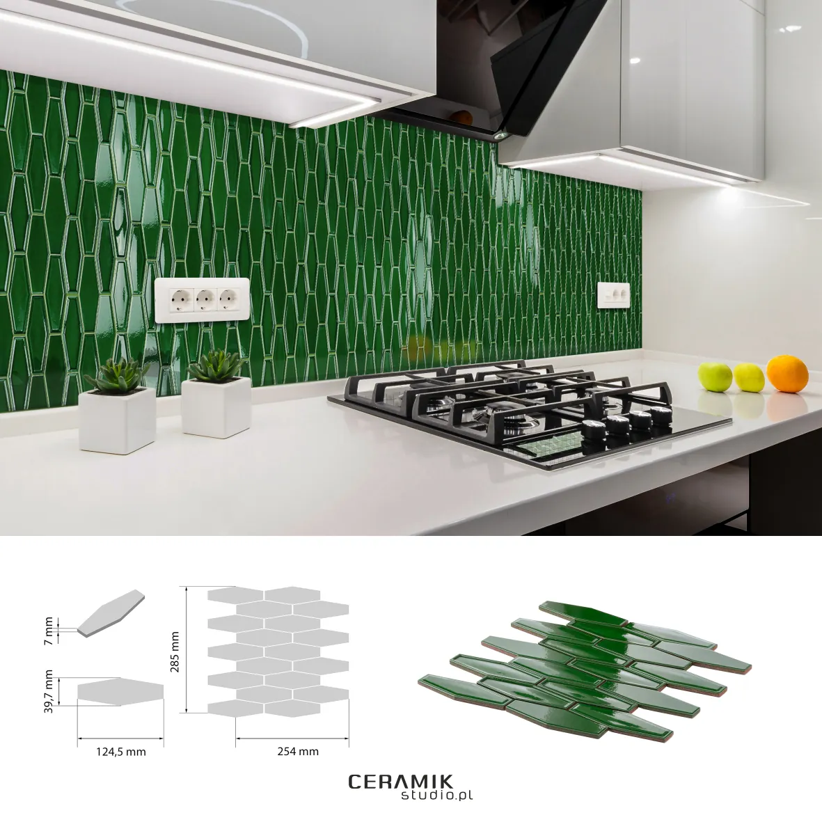 Produkt wykonany jest z ceramiki – materiału trwałego i łatwego w utrzymaniu. Wykończenie połyskowe zapewnia efekt premium. Grubość 7 mm oraz klasa I gwarantują wysoką odporność mechaniczną i estetyczną. Mozaika została wypalona w temperaturze powyżej 1000 °C, co skutkuje klasą reakcji na ogień A1 — nadaje ją do zastosowań wymagających odporności termicznej.